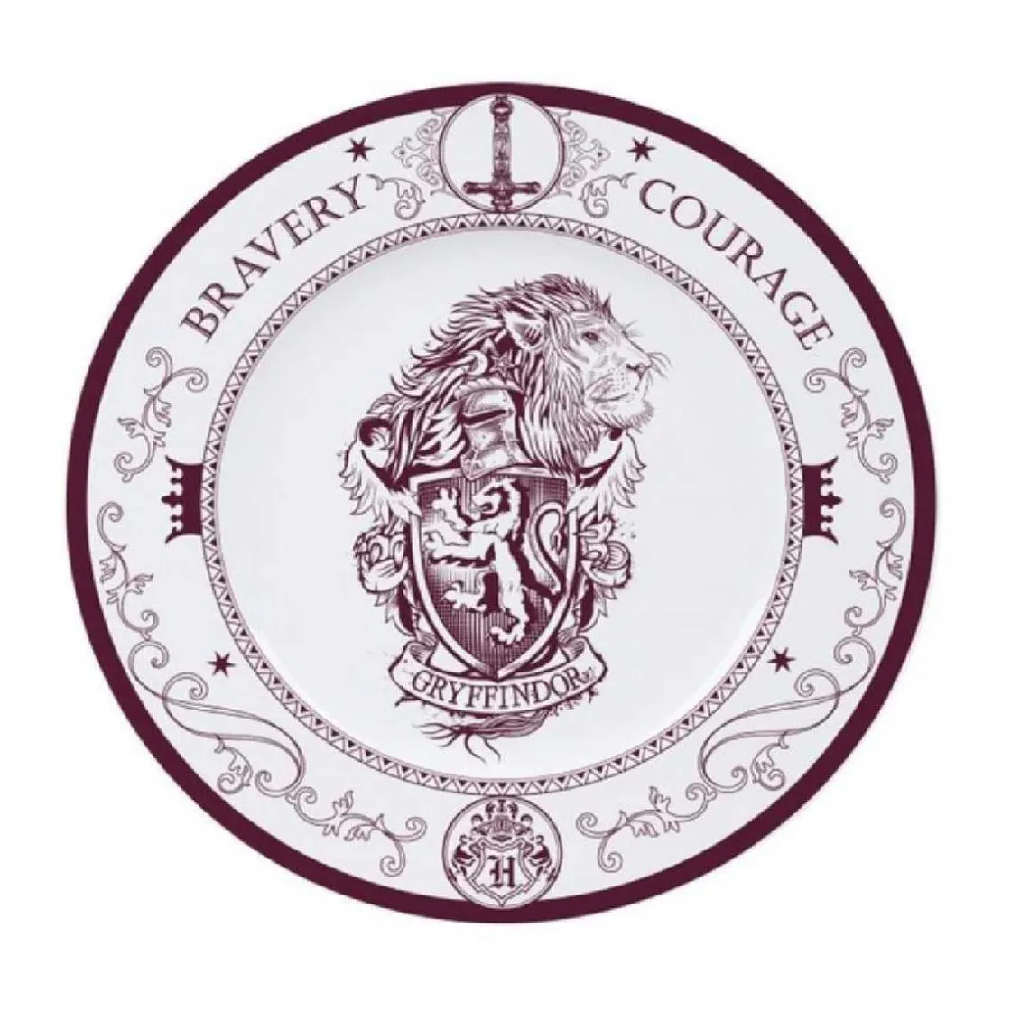 Cada plato tiene reproducido con todo detalle el escudo de armas de cada una de las casas, en el color correspondiente a cada casa y con las palabras que mejor definen el espíritu de cada una.
