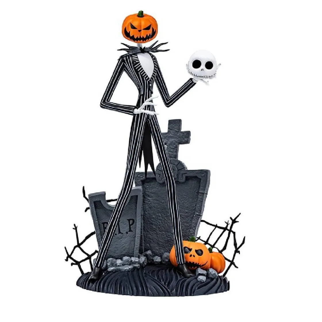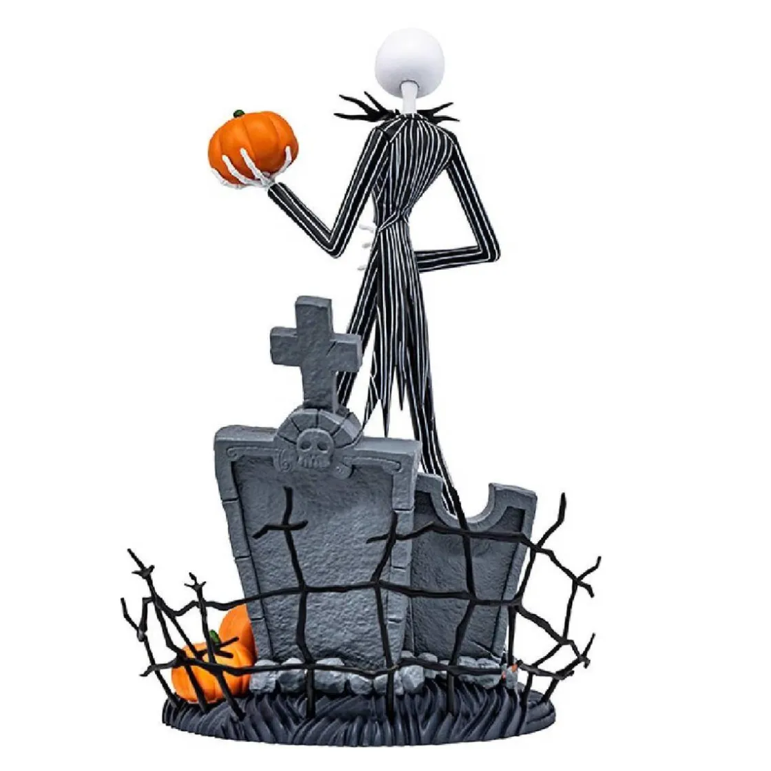 Esta figura de Super Figure Collection está sobre una base muy detallada con tumbas y calabazas y tiene la cabeza intercambiable con una calabaza.