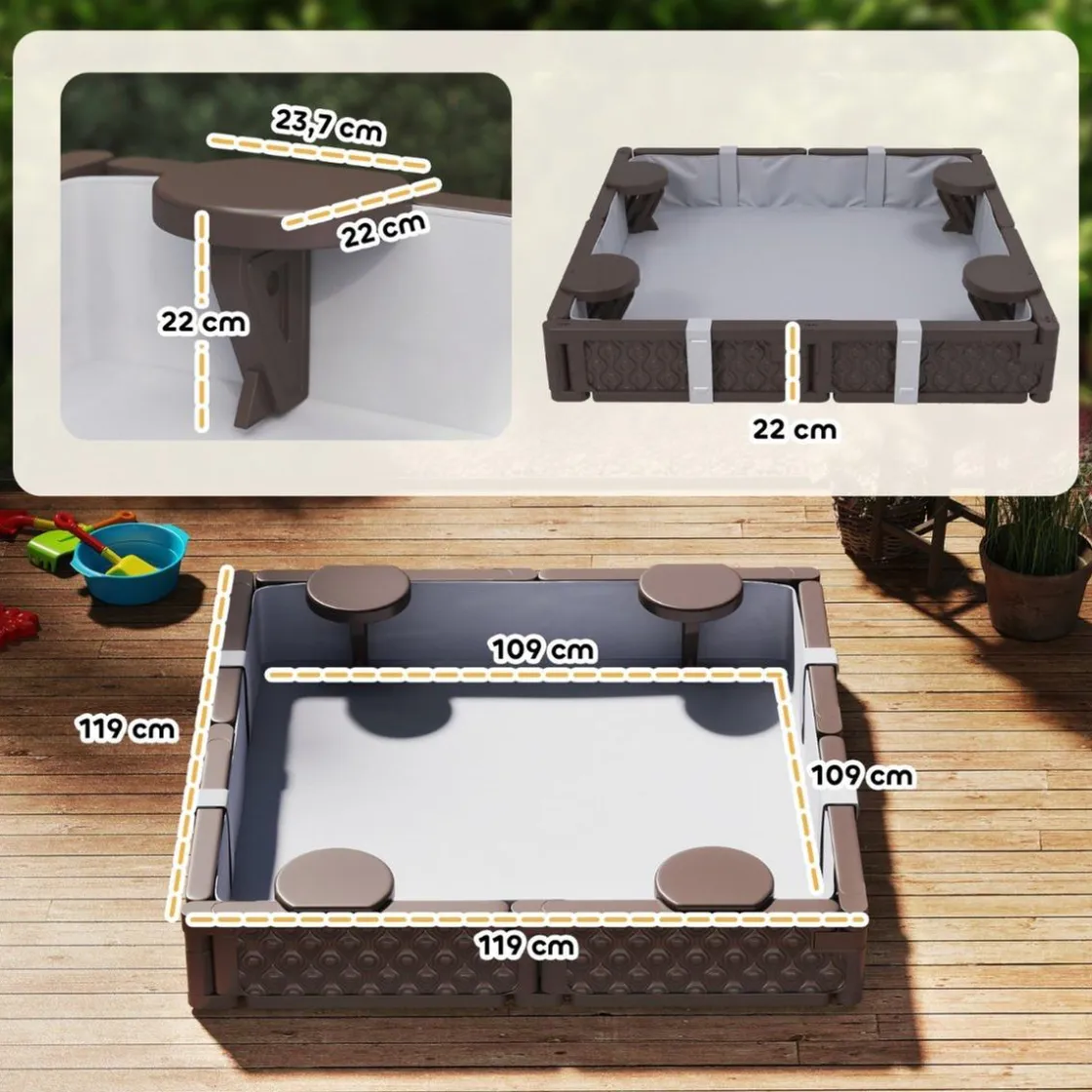Este arenero infantil es la opción perfecta para que los más pequeños disfruten de horas de juego al aire libre. Con un diseño cuadrado de 119x119x22 cm, ofrece un espacio amplio y seguro para que los niños desarrollen su creatividad y habilidades sociales.