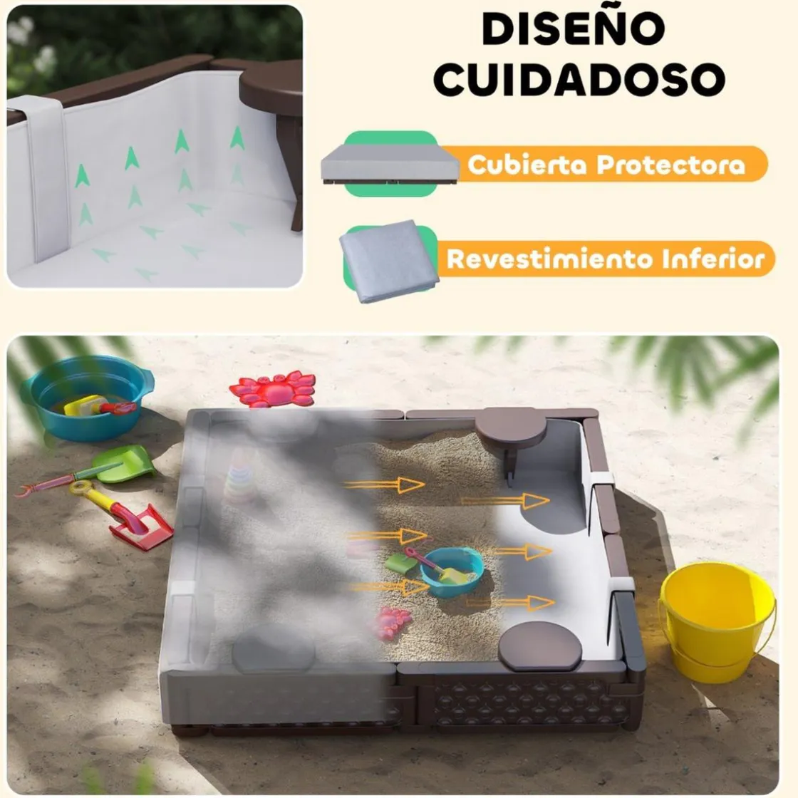 - Incluye cubierta de tela Oxford: protege la arena de la lluvia y el sol, manteniéndola seca y limpia.