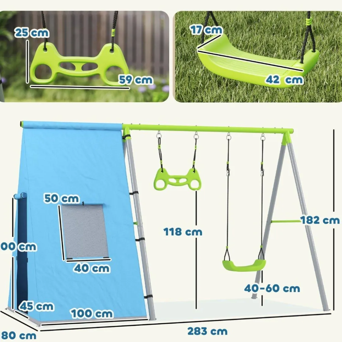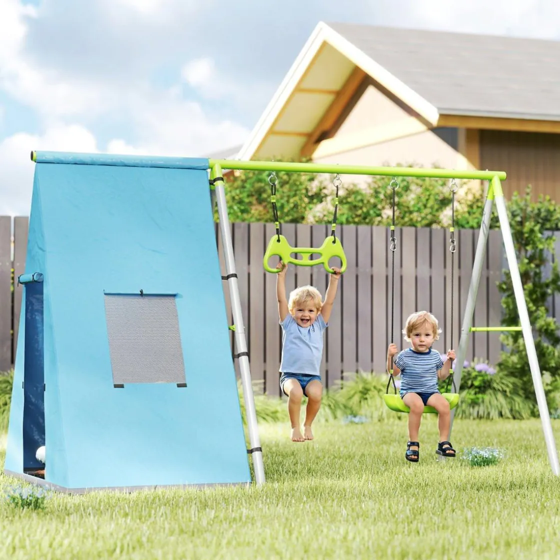 ¡Transforma tu jardín en un parque de diversiones lleno de diversión con este conjunto 3 en 1 de Aiyaplay! Perfecto para hasta cuatro niños de 3 a 8 años, incluye un columpio infantil, anillas de gimnasia y una tienda acogedora.