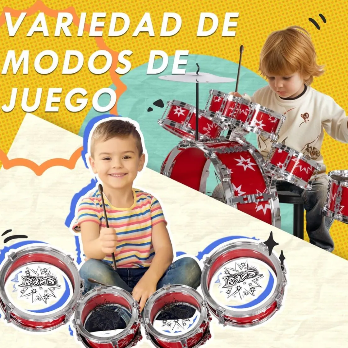 - Set de batería con 7 piezas para una experiencia musical completa.