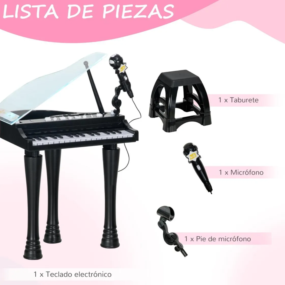 - Piano infantil que incluye 22 canciones y 4 tonos, y micrófono con amplificación.