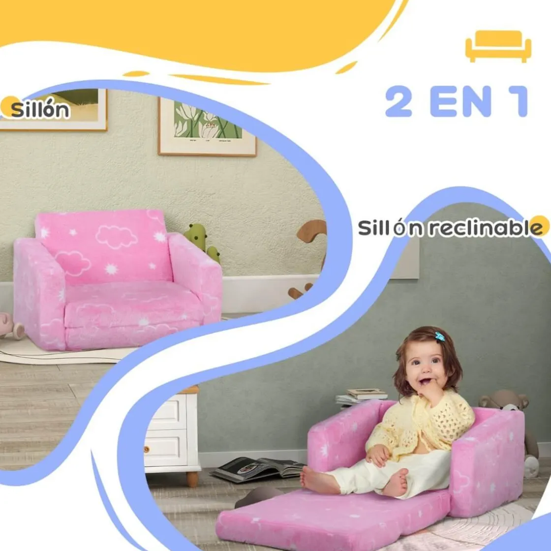 - Sillón infantil fabricado con espuma suave, cuenta con un amplio respaldo y reposabrazos para mayor comodidad.