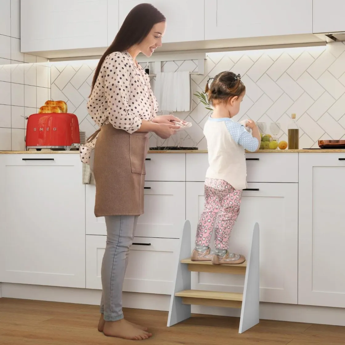 Este taburete infantil de AIYAPLAY es perfecto para ayudar a los pequeños a alcanzar la altura que necesitan para sus actividades diarias de forma segura y sin esfuerzo. Con su diseño de dos niveles y estructura ligera, es fácil de mover y muy práctico.