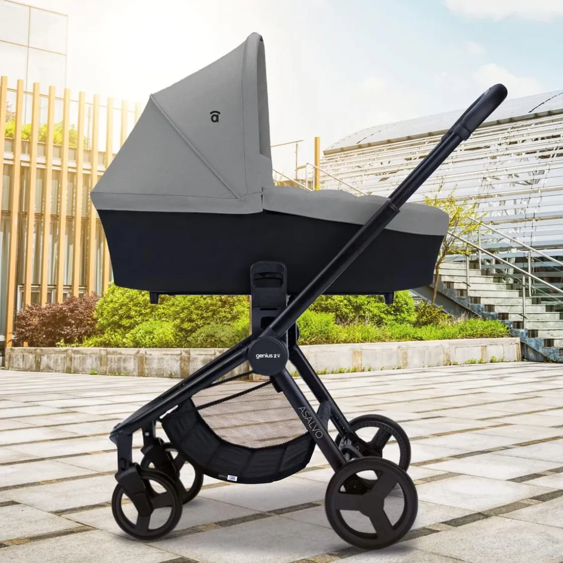 Asalvo – Trío Genius 2 Gris. En el Trío Genius 2 tendrás todo lo que necesitas: silla de paseo, capazo, silla de auto y bolso cambiador.