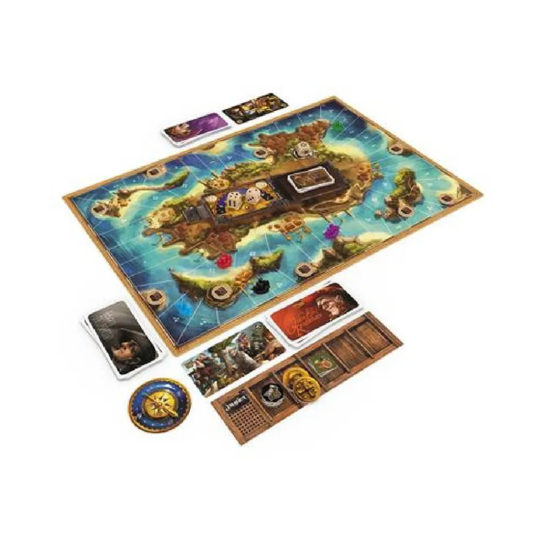 Incluye: 1 tablero, 66 cartas de acción, 12 de tesoro, 80 doblones de oro, 45 fichas de víveres, 45 fichas de pólvora, 9 fichas de tesoro, 1 brújula, 2 dados de acción, 6 barcos, 6 bodegas, 1 dado de combate y 1 reglamento.