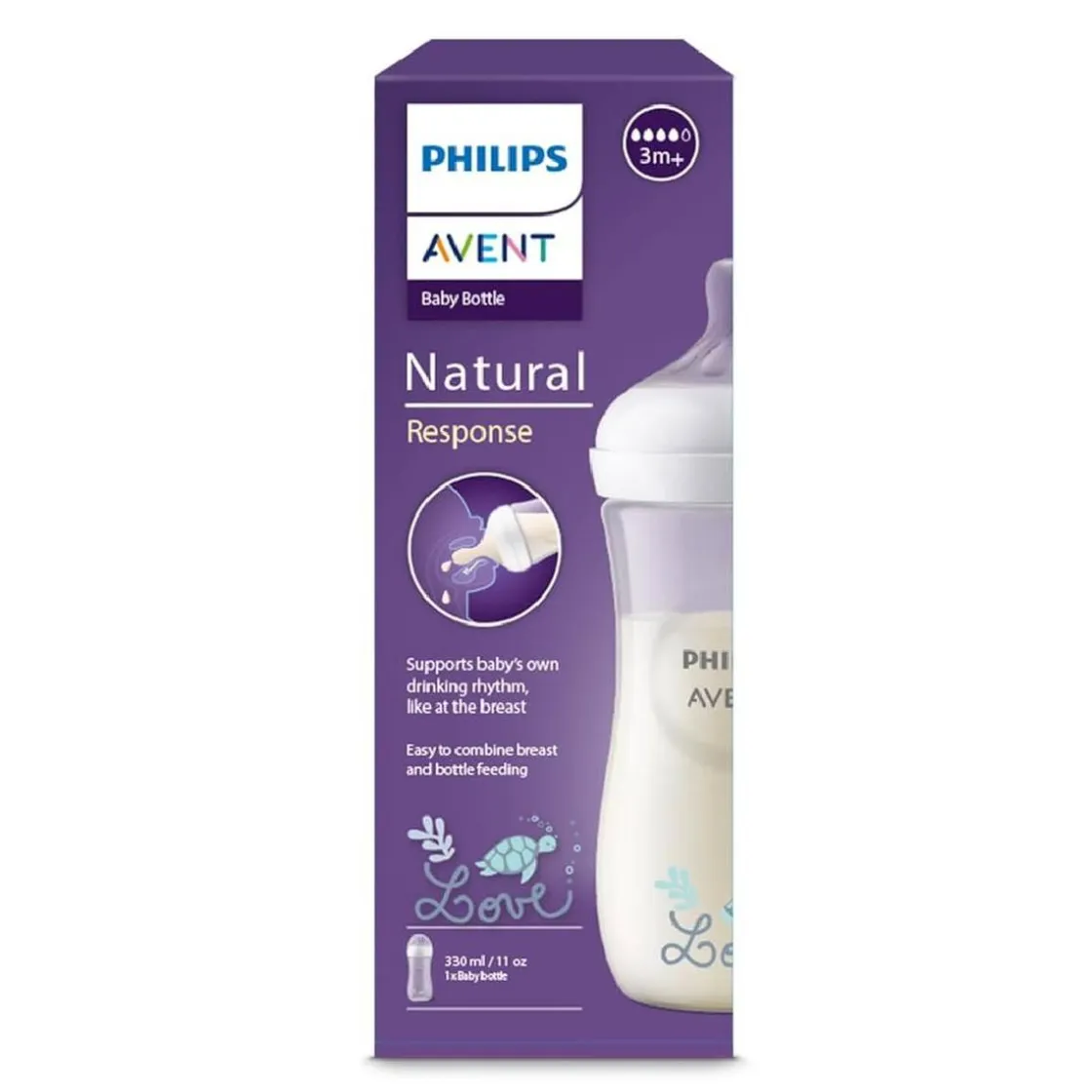 Philips Avent – Biberón Natural Response 330 ml Tortuga, diseñado para ofrecer una experiencia de alimentación que imita la lactancia materna, facilitando la transición entre el pecho y el biberón.