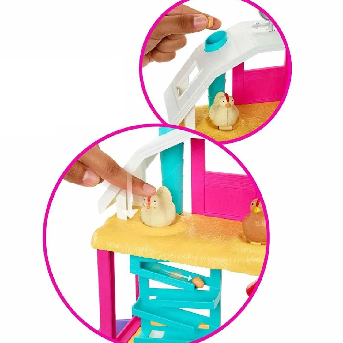 Barbie – Diversión en la granja, un conjunto de juego con todo lo necesario para cuidar a las gallinas que ponen huevos, al conejito y al ternerito.
