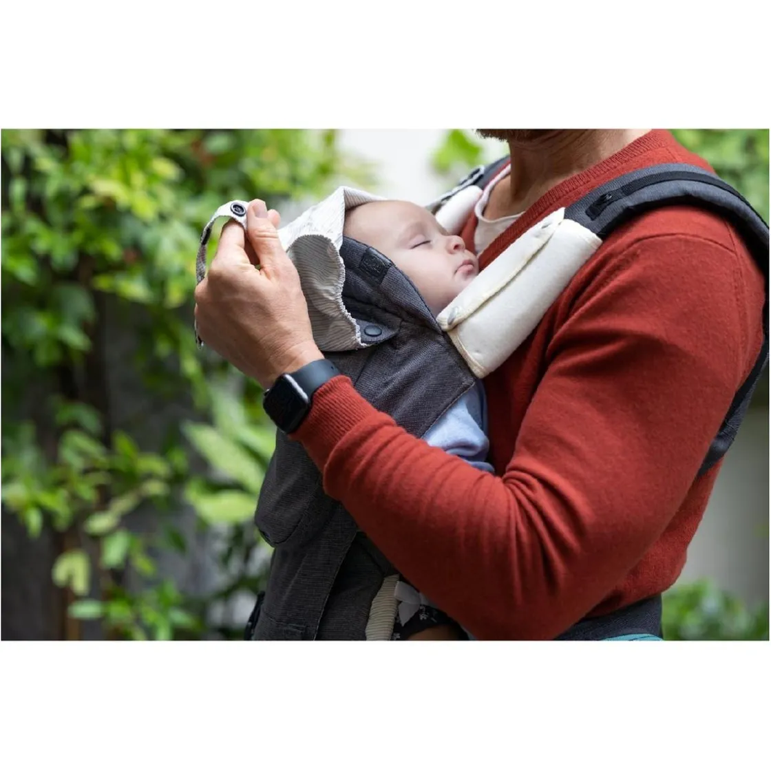 El portabebés es lavable a máquina a 30°C y apto para secadora, lo que facilita su limpieza y conservación. Incluye una funda del mismo material para guardarlo de manera higiénica cuando no lo estés utilizando.