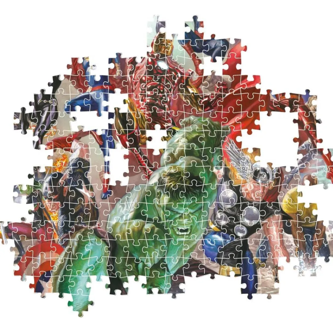 El puzzle montado mide 49 × 36 cm, tamaño ideal para disfrutar de todos los detalles del diseño, desde los trajes icónicos de los superhéroes hasta el fondo lleno de acción y dinamismo.