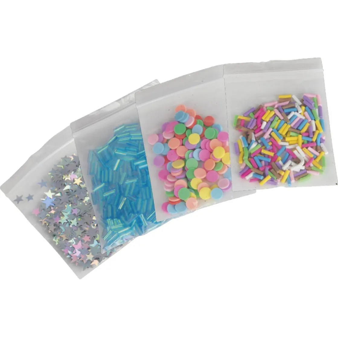 - 4 sobres de adornos brillantes y coloridos: para mezclar o simplemente añadir encima de tus mezclas.