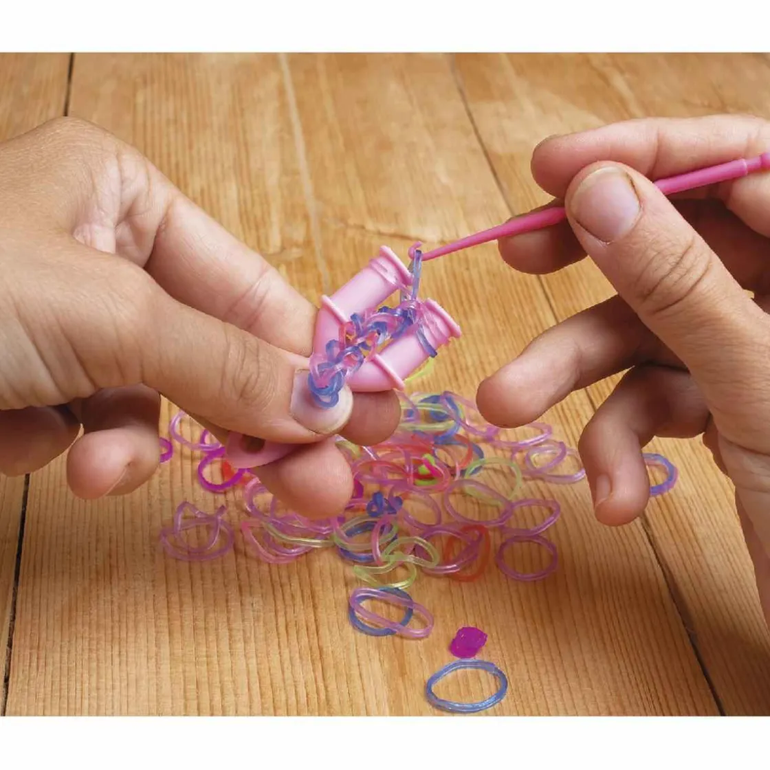 Incluye más de 8.000 bandas elásticas de colores, un práctico manual ilustrado paso a paso y todas las herramientas necesarias en una práctica caja con estantes para llevar tu kit a cualquier parte.