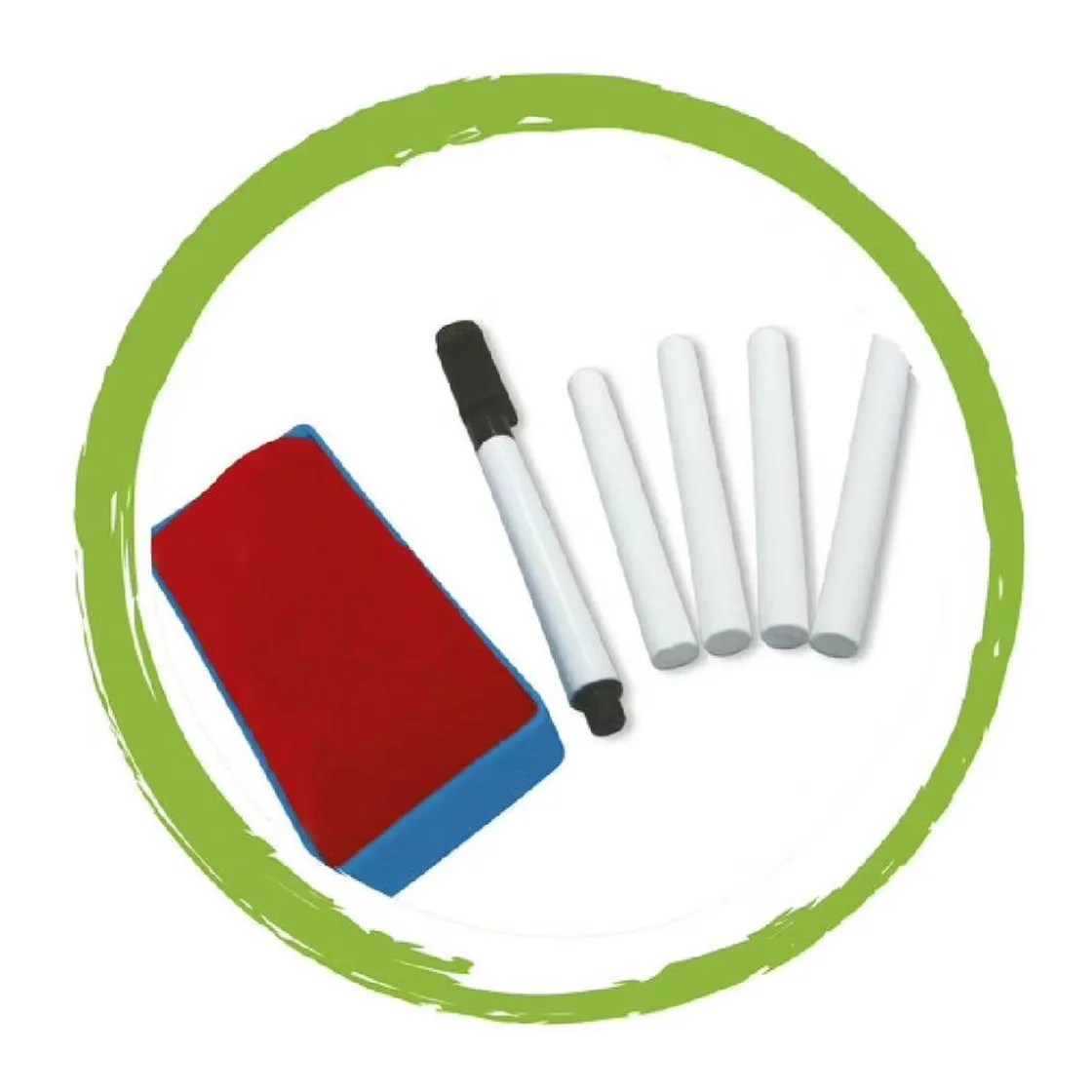 Incluye: un borrador, caja de tizas y rotulador de pizarra.