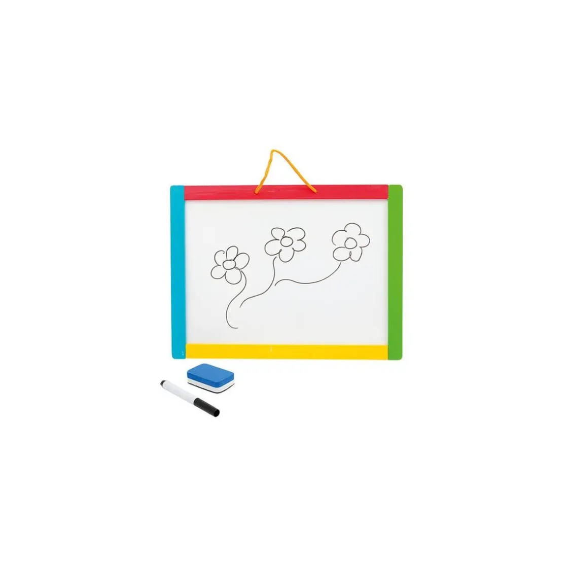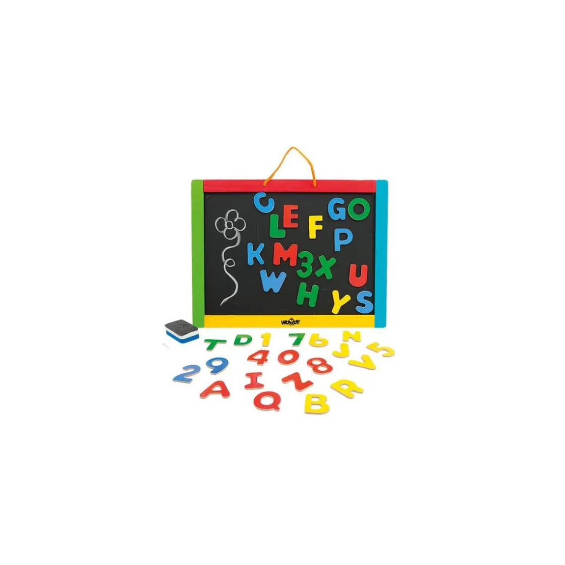Tiene una cara negra para dibujar con tiza y una superficie blanca magnética para pegar y jugar con las formas coloridas.