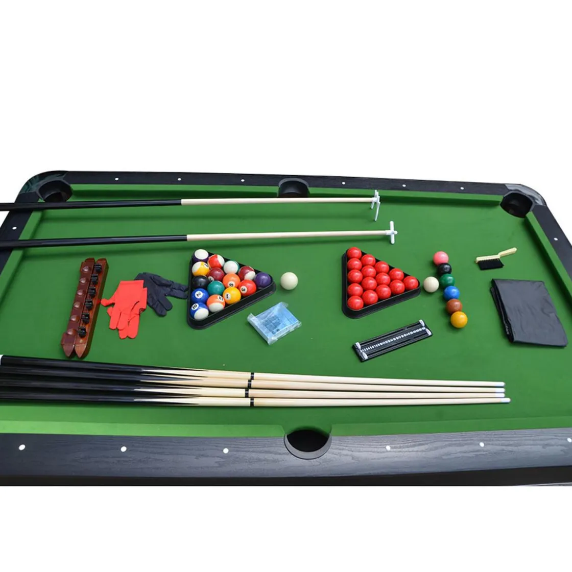 - Accesorios incluidos: bola de billar, triángulo para snooker, triángulo, 4 tacos 57”, 2 sticks, 6 orificios raqueta, tapa de color verde, 2 guantes negros, 2 guantes rojos, una caja de tizas con 20 piezas, 1 cepillo, 1 marcador, 1 funda.