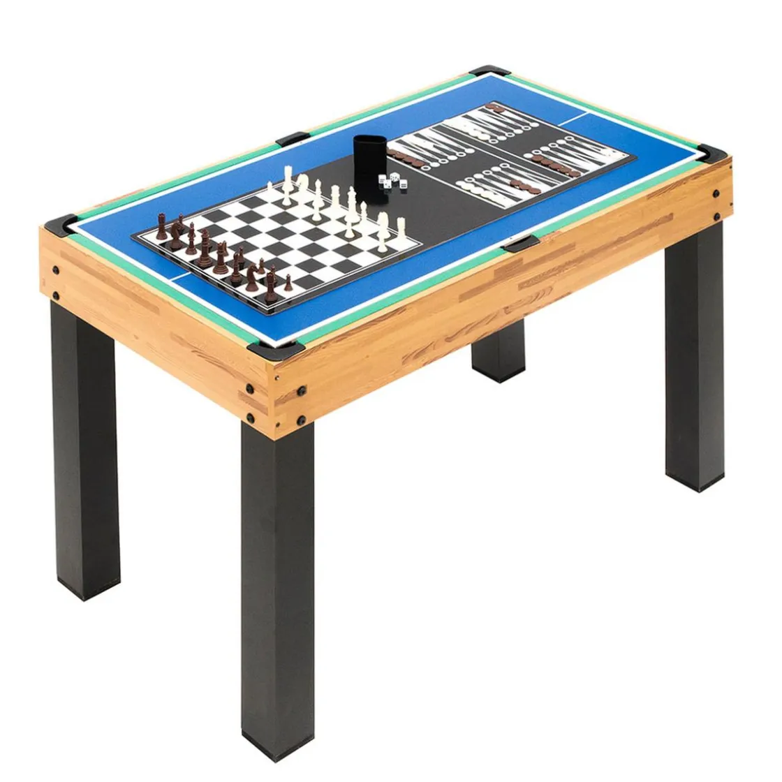 Esta mesa es de muy fácil manejo y montaje. Incluye los siguientes juegos: Futbolín, Billar, Ping-Pong, Push Hockey, Ice Hockey, Dados, Póker, Ajedrez, Anillas, Herradura, Backgammon y Bolos. Multijuego de fácil conversión juego a juego.
