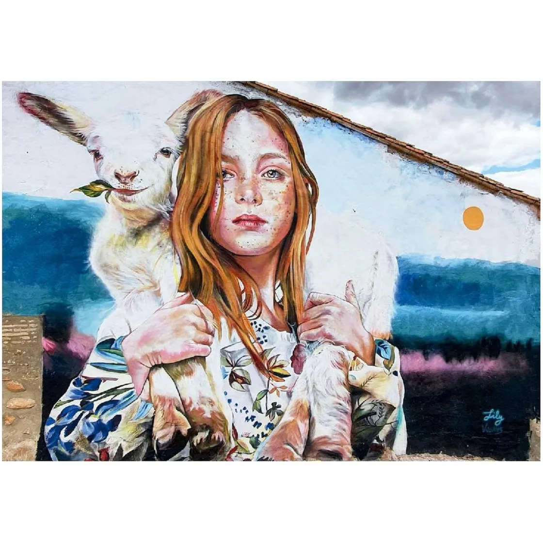 Una magnífica ilustración de la obra de Lily Brick que representa a una niña cargando una oveja y que se encuentra en un muro del pueblo zaragozano de Torrellas.