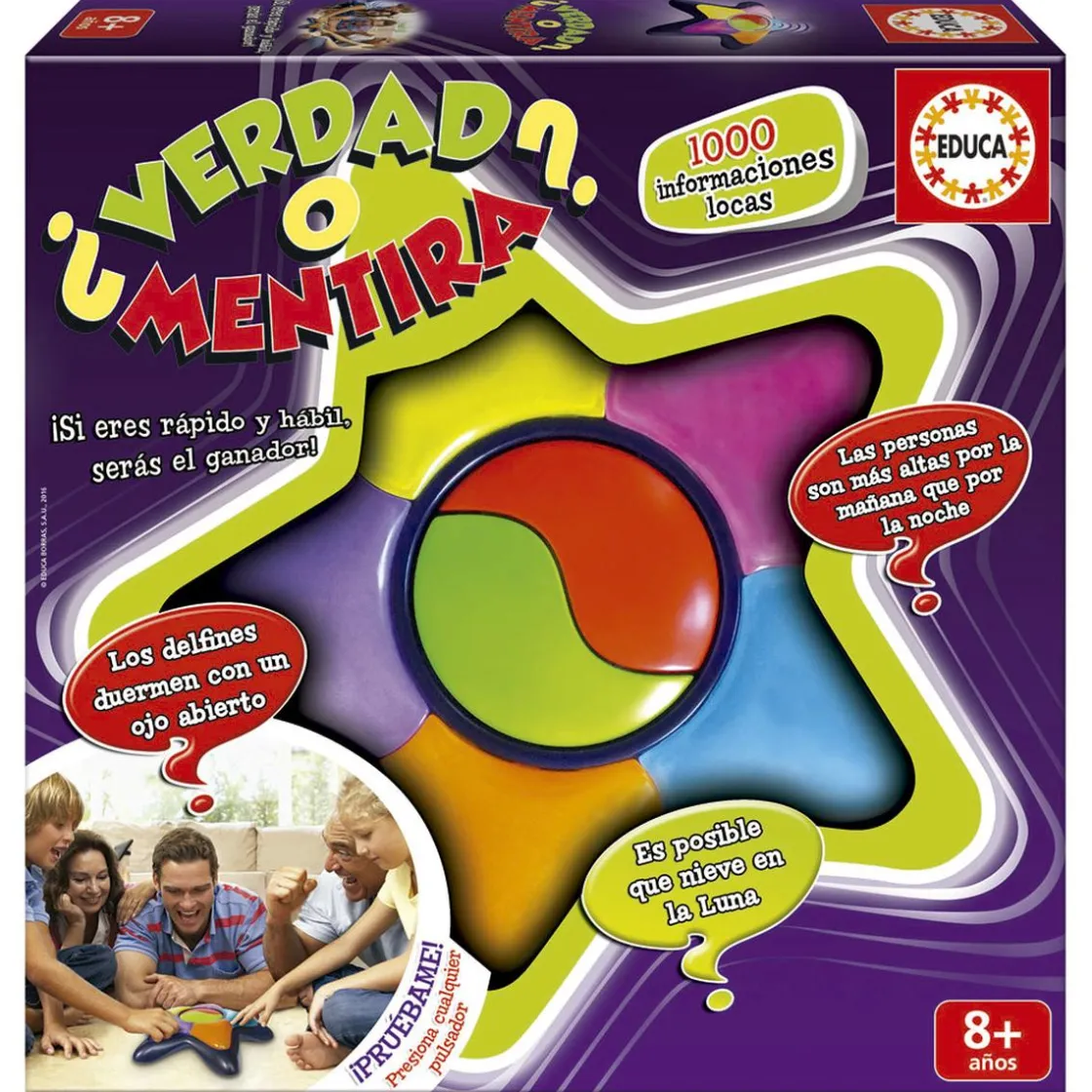 Verdad o Mentira. ¡Un juego para toda la familia, lleno de anécdotas extraordinarias! Sigue las instrucciones del presentador y prepárate para grandes sorpresas. Escucha la insólita información que cuenta el presentador y adivina si es Verdadera o Falsa. ¡Prepárate para ser el más rápido en contestar! Obtendrás un punto si contestas correctamente…¡Pero cuidado, perderás dos si la respuesta no es correcta! Consigue el mayor número de puntos posible en las 3 rondas que tiene juego. Número jugadores: 2-5. Edad recomendada + 8 años.