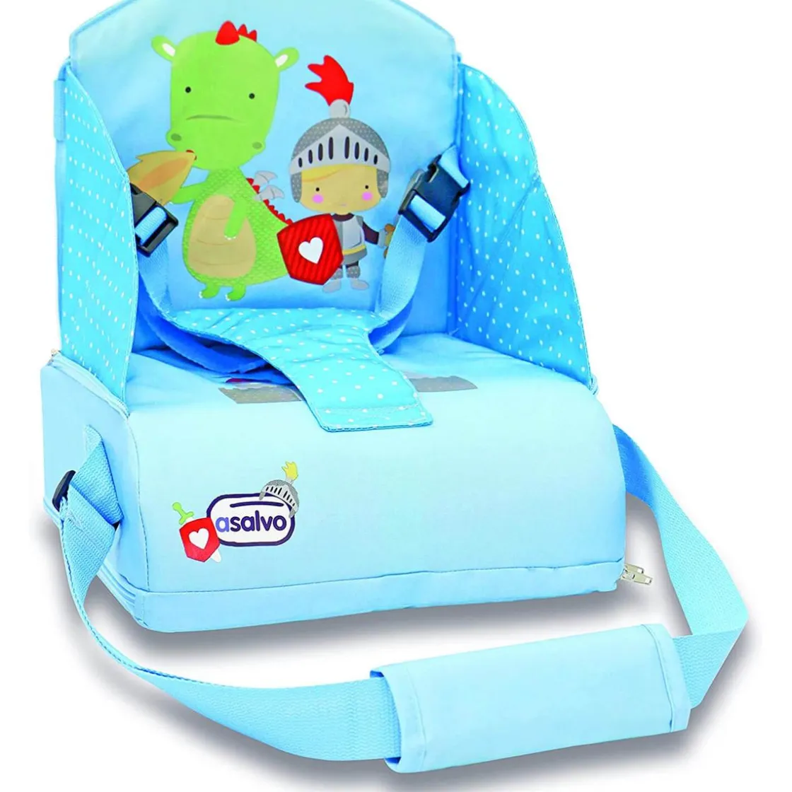 Asalvo – Trona de viaje Camelot. ¡Vamos a comer fuera! Y, por supuesto, el bebé tiene el mejor sitio. Porque con esta trona de viaje Camelot de Asalvo podrás sentarlo donde quieras: la trona se adapta a todas las sillas por el asiento y por el respaldo, y de forma rápida y segura.