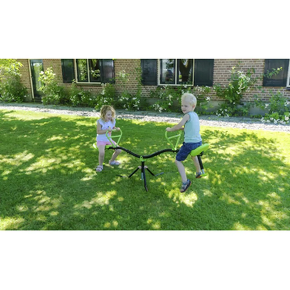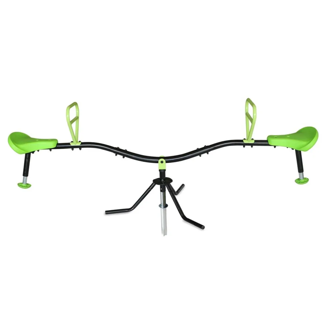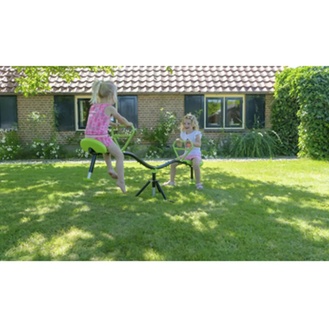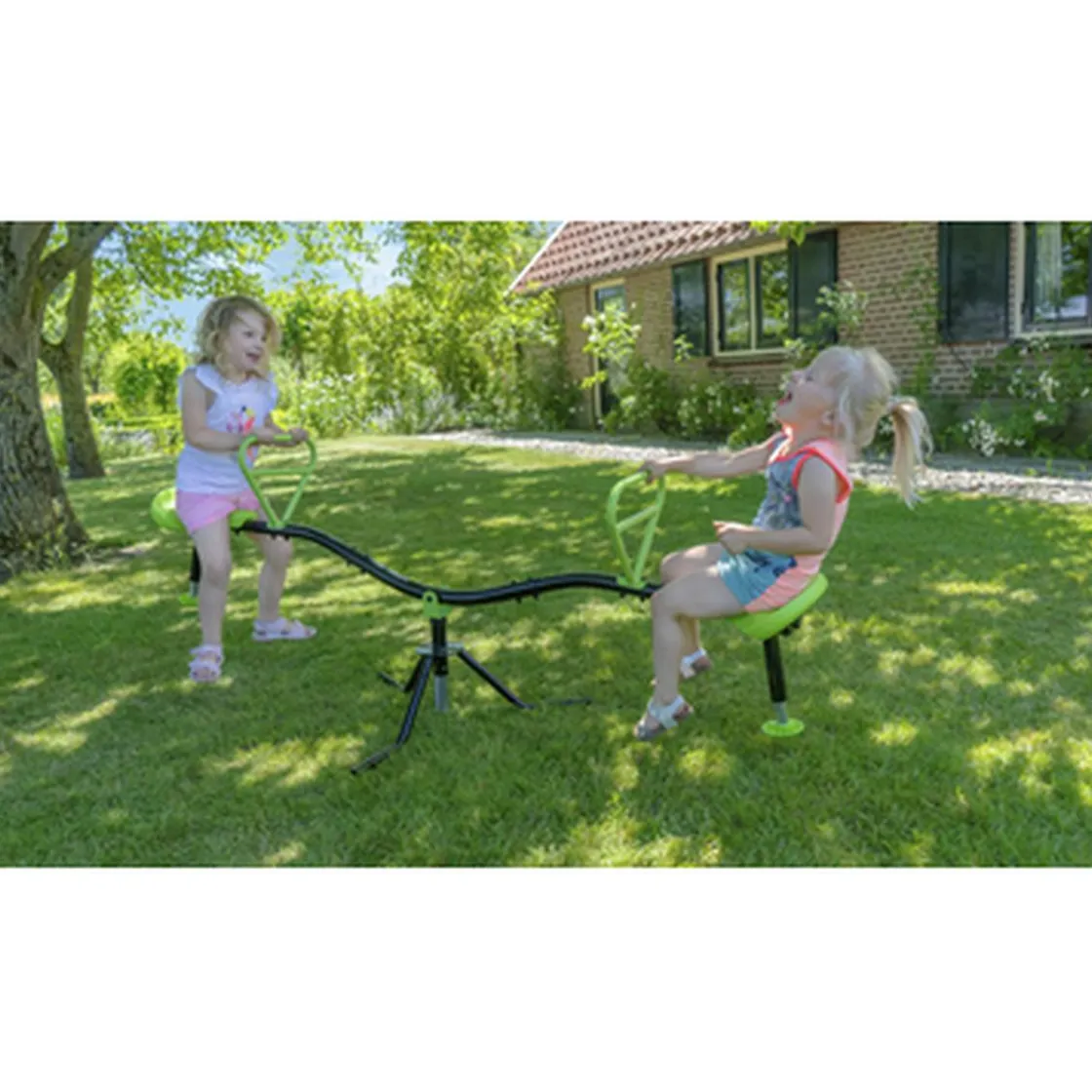 Exit Balancín giratorio Spinner. ¡El balancín giratorio Exit Spinner no es simplemente un balancín! Este balancín negro y verde no solo se mueve hacia arriba y hacia abajo, sino que también puede girar. ¡Y debajo del asiento del balancín hay un resorte adicional para disfrutar aún más del juego!