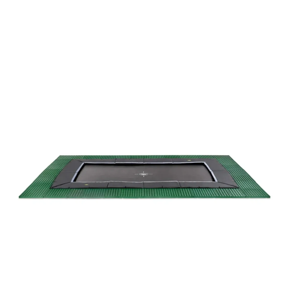El trampolín Dynamic se instala a nivel del suelo completamente enterrado. El protector acolchado está al mismo nivel que el césped, por lo que el trampolín está totalmente integrado en el resto del jardín.