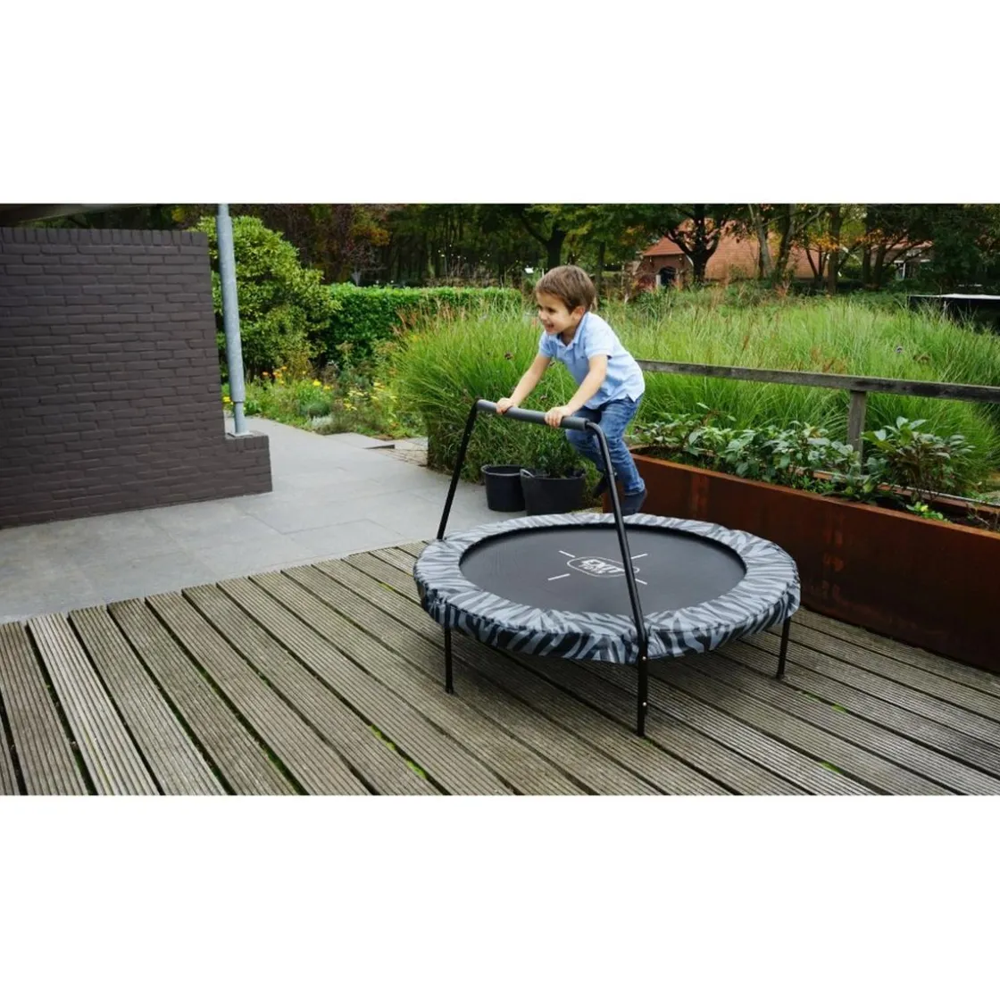 Este trampolín redondo y compacto tiene una barra para agarrarse mientras saltan y tiene un escalón bajo, para que incluso los niños más pequeños puedan subir fácilmente al trampolín.