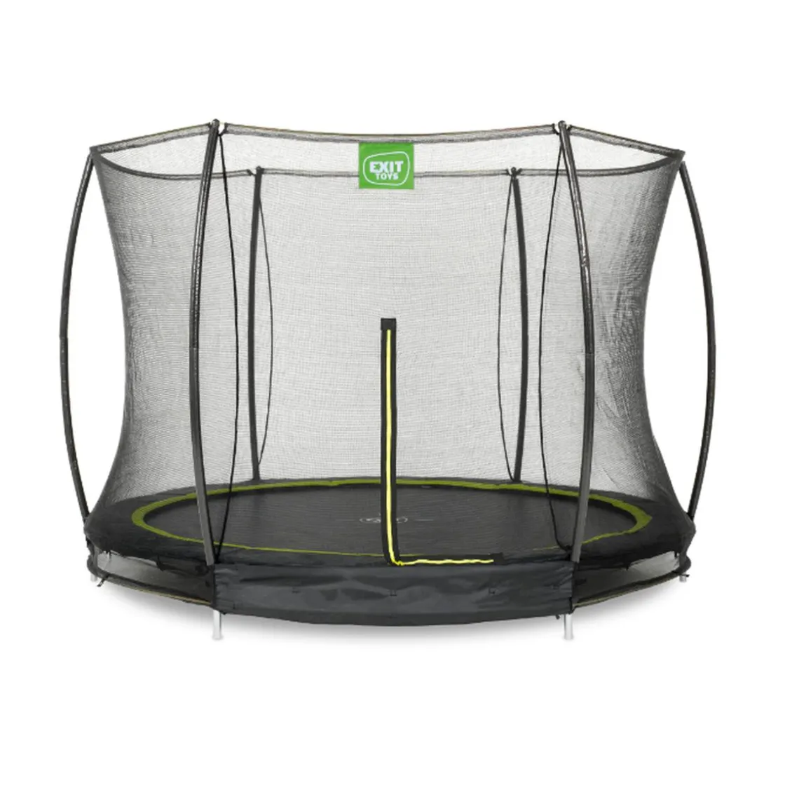 El trampolín Exit Silhouette en el suelo con red de seguridad es un trampolín redondo de buena calidad.