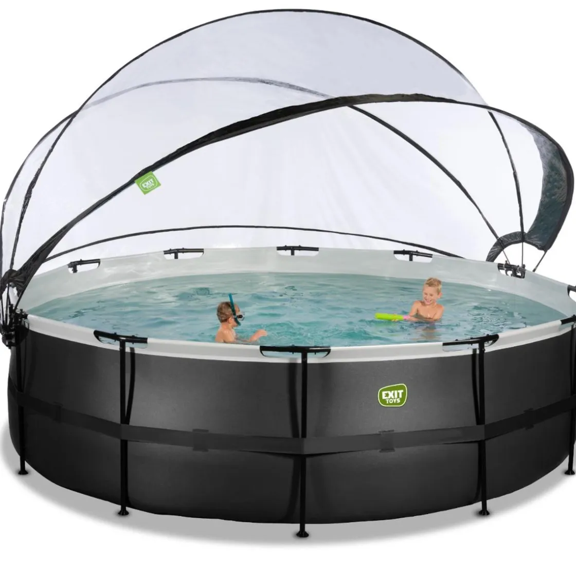 Exit – Piscina Black Leather diámetro 488 x 122 cm con filtro de arena, cúpula y bomba de calor, una piscina redonda con efecto de cuero negro y cúpula.