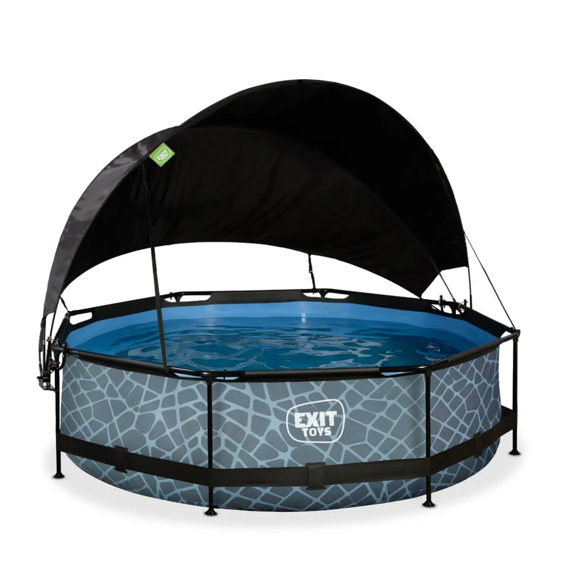 Exit – Piscina Stone efecto piedra gris diámetro 300 x 76 cm con filtro y toldo negro, una piscina redonda de color gris con efecto de piedra que se integra perfectamente en tu jardín.
