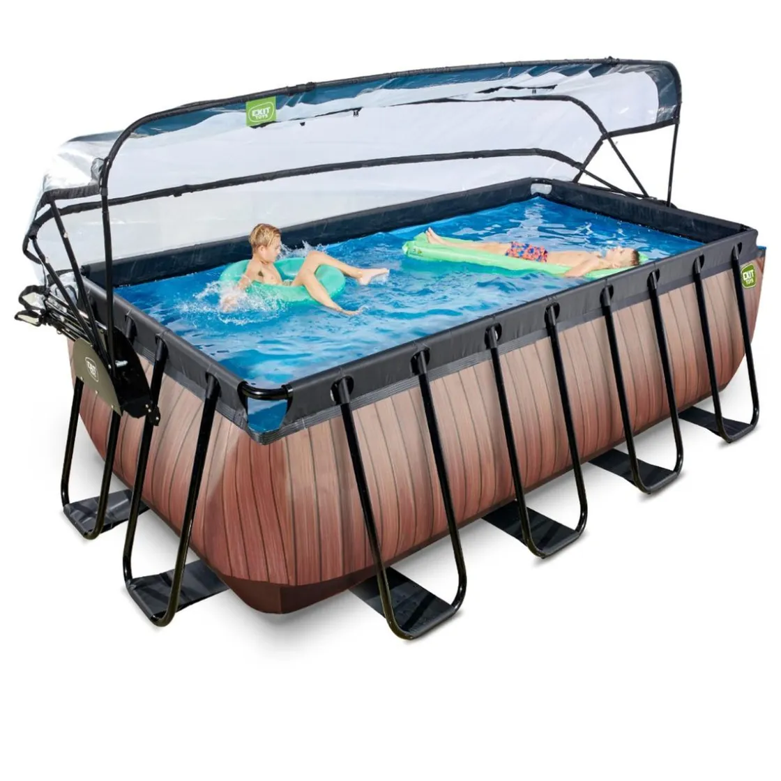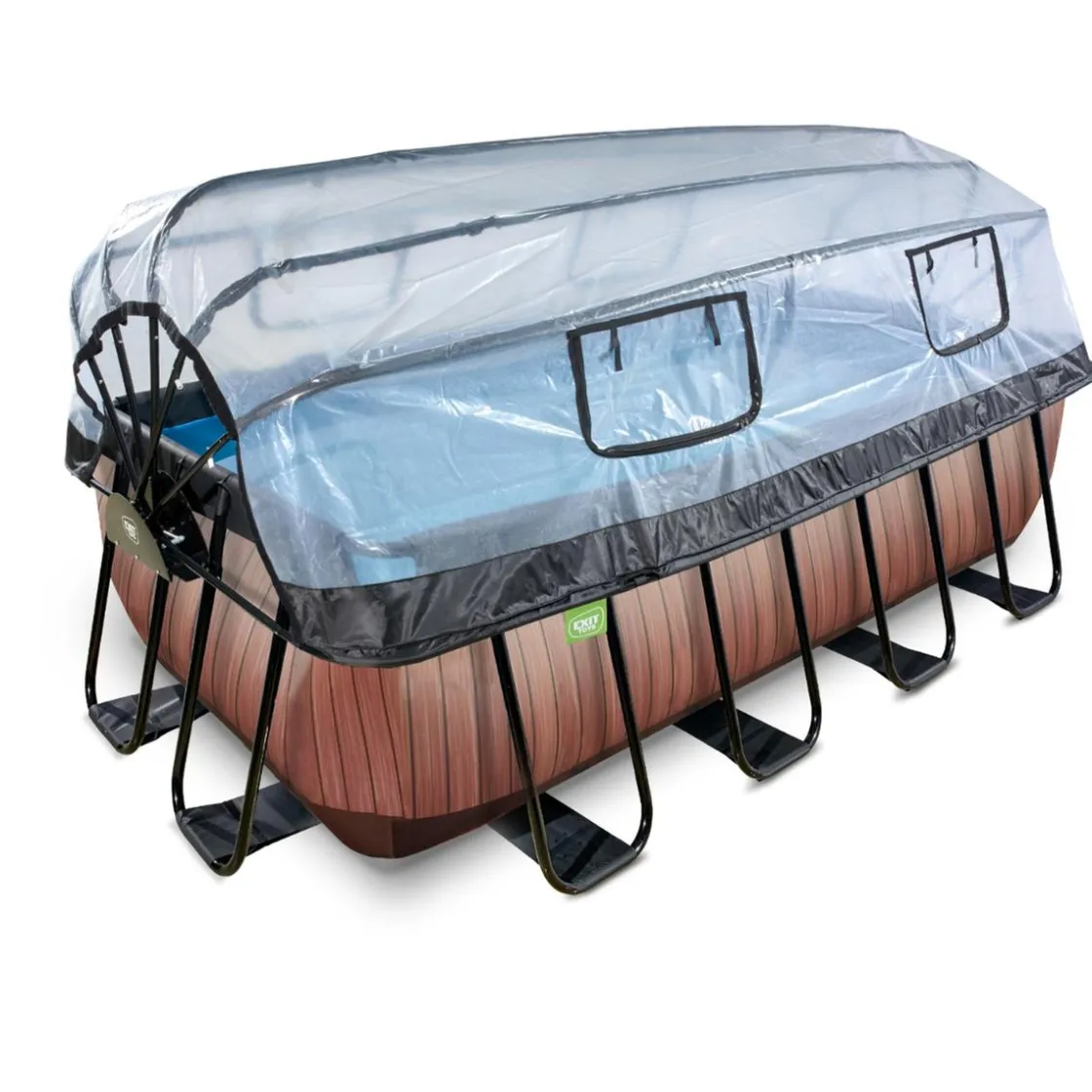 Exit – Piscina Wood efecto madera 400 x 200 x 122 cm con filtro de arena, cubierta protectora y bomba de calor, una piscina de marco rectangular con aspecto de madera y con cúpula.