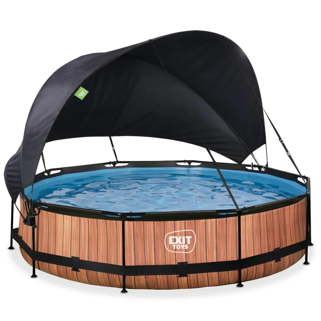 Exit – Piscina Wood efecto madera diámetro 360 x 76 cm con filtro y toldo negro, una piscina redonda con un patrón de madera natural que se integra perfectamente en tu jardín.