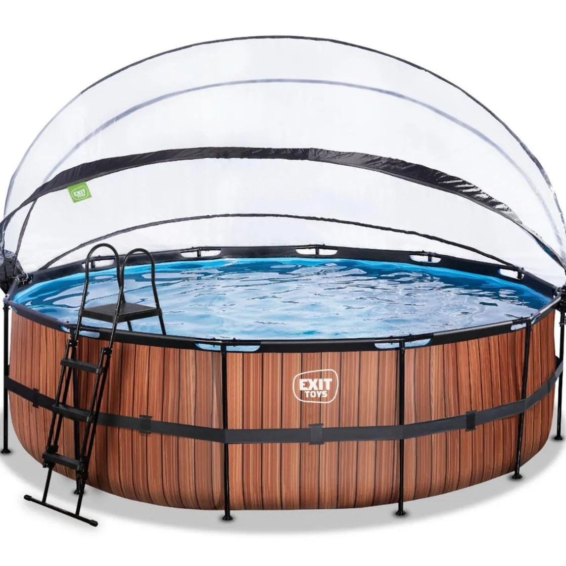 Exit – Piscina Wood efecto madera diámetro 488 x 122 cm con filtro de arena, cubierta protectora y bomba de calor, una piscina de marco redondo con aspecto de madera y con cúpula.