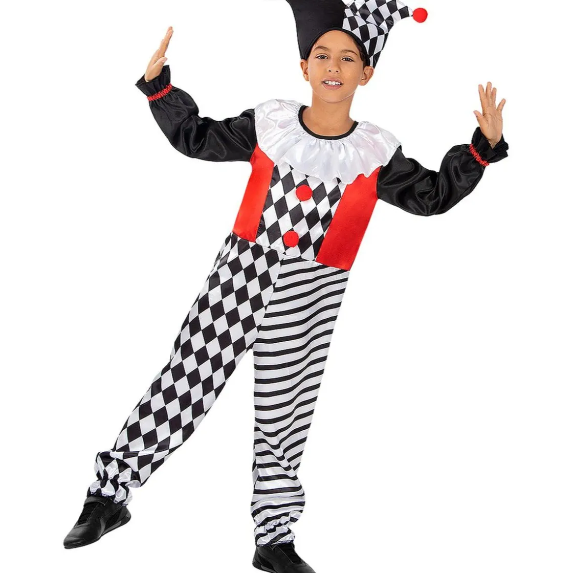 Combinación única de satén y poliéster en un mono con diseño geométrico audaz. Incluye gorro flexible con cascabeles para realzar el look festivo. ¡Ideal para primeros disfraces con comodidad garantizada!