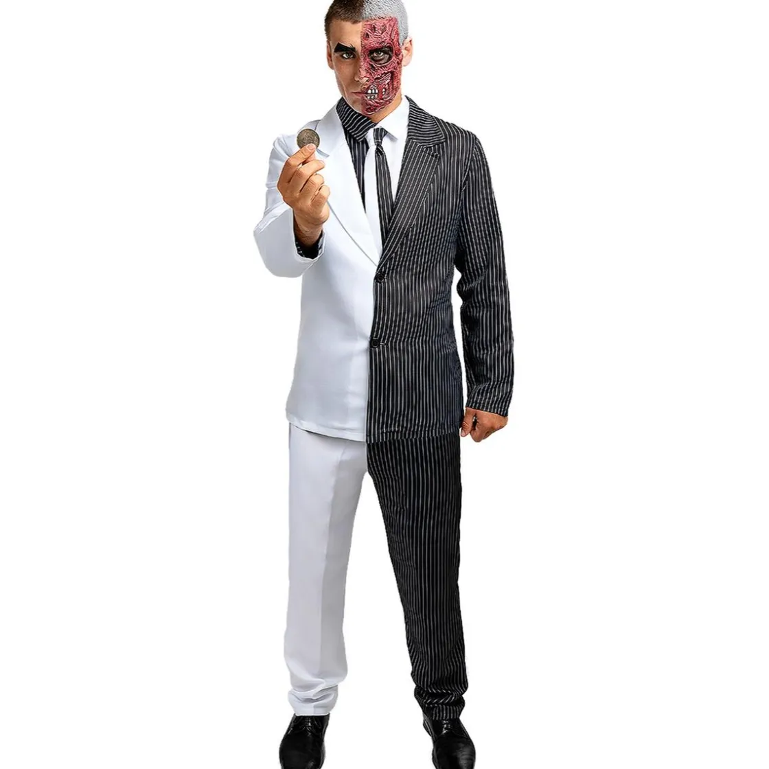 Este disfraz en talla Standard es perfecto para encarnar a Dos Caras, el villano más ambivalente de Gotham. Consta de pantalón, chaqueta, camisa y corbata con diseño asimétrico, que representan la dualidad del personaje. La máscara y la moneda completan el conjunto, logrando un look escalofriante y auténtico.