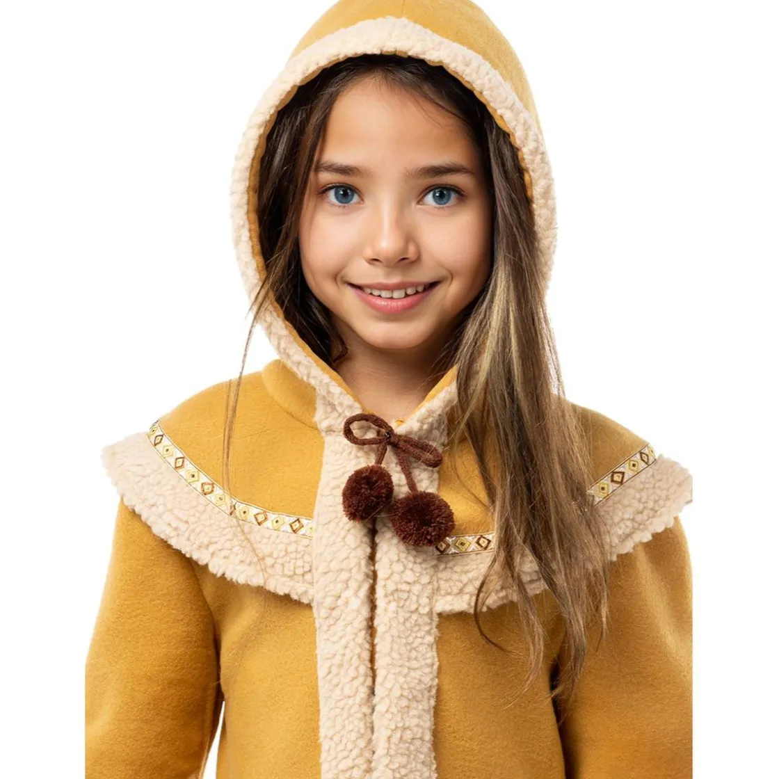 ¡Las pequeñas exploradoras vivirán mil aventuras polares con este disfraz de esquimal para niña! El vestido y cubrebotas, en poliéster 100%, incluyen detalles adorables como pompones y bordados. Perfecto para festivales invernales, obras escolares o juegos creativos. Un traje que combina diversión y calidez para las más intrépidas.