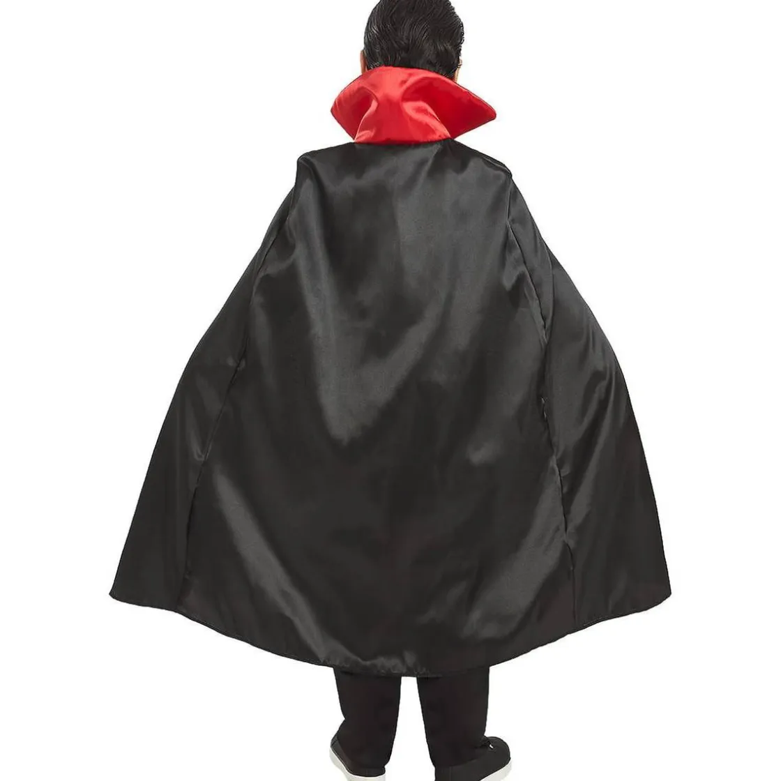 - Incluye: Pantalón negro de corte recto, camisa blanca con chaleco rojo integrado con efecto aterciopelado y botones dorados, y capa negra con cuello rígido rojo al estilo Transilvania.