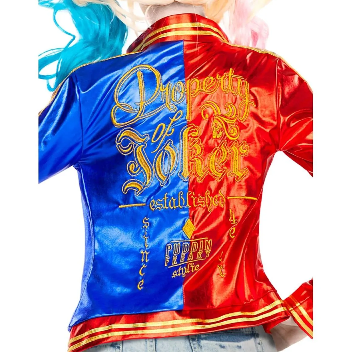 Con este kit en talla XL podrás recrear el look más atrevido de Harley Quinn en Escuadrón Suicida. Su chaqueta brillante de estilo bicolor y la camiseta impresa evocan el estilo desenfadado y rebelde del personaje más icónico de DC Comics.