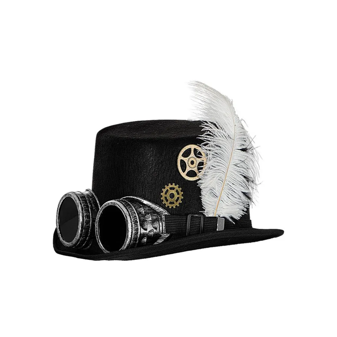 El complemento definitivo para viajes interdimensionales. Gafas giratorias con lentes color ámbar y sombrero de fieltro con engranajes móviles que añaden carácter a cualquier disfraz base.