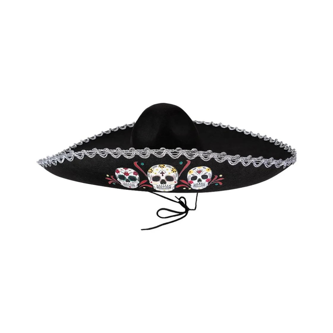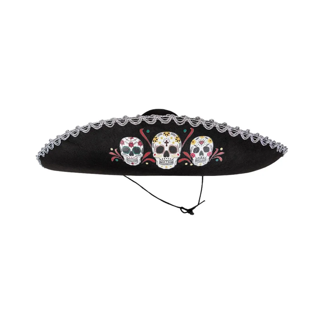 Este sombrero de Día de los Muertos para hombre mide 54-60 cm e incluye un diseño tradicional, perfecto para completar disfraces temáticos. Su estilo festivo rinde homenaje a la cultura mexicana.