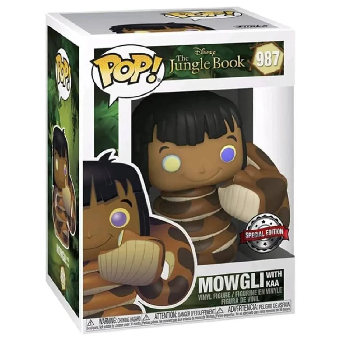 Esta figura exclusiva presenta a Mowgli junto a la serpiente Kaa, recreando uno de los momentos más emblemáticos de El Libro de la Selva. El diseño destaca por su autenticidad y detalle, reflejando la inocencia y el espíritu aventurero del joven protagonista.