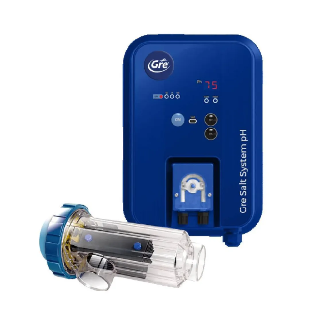 Clorador salino para piscinas de hasta 60 m³, electrólisis de sal con control de pH y bomba dosificadora incluida para piscinas elevadas y enterradas.