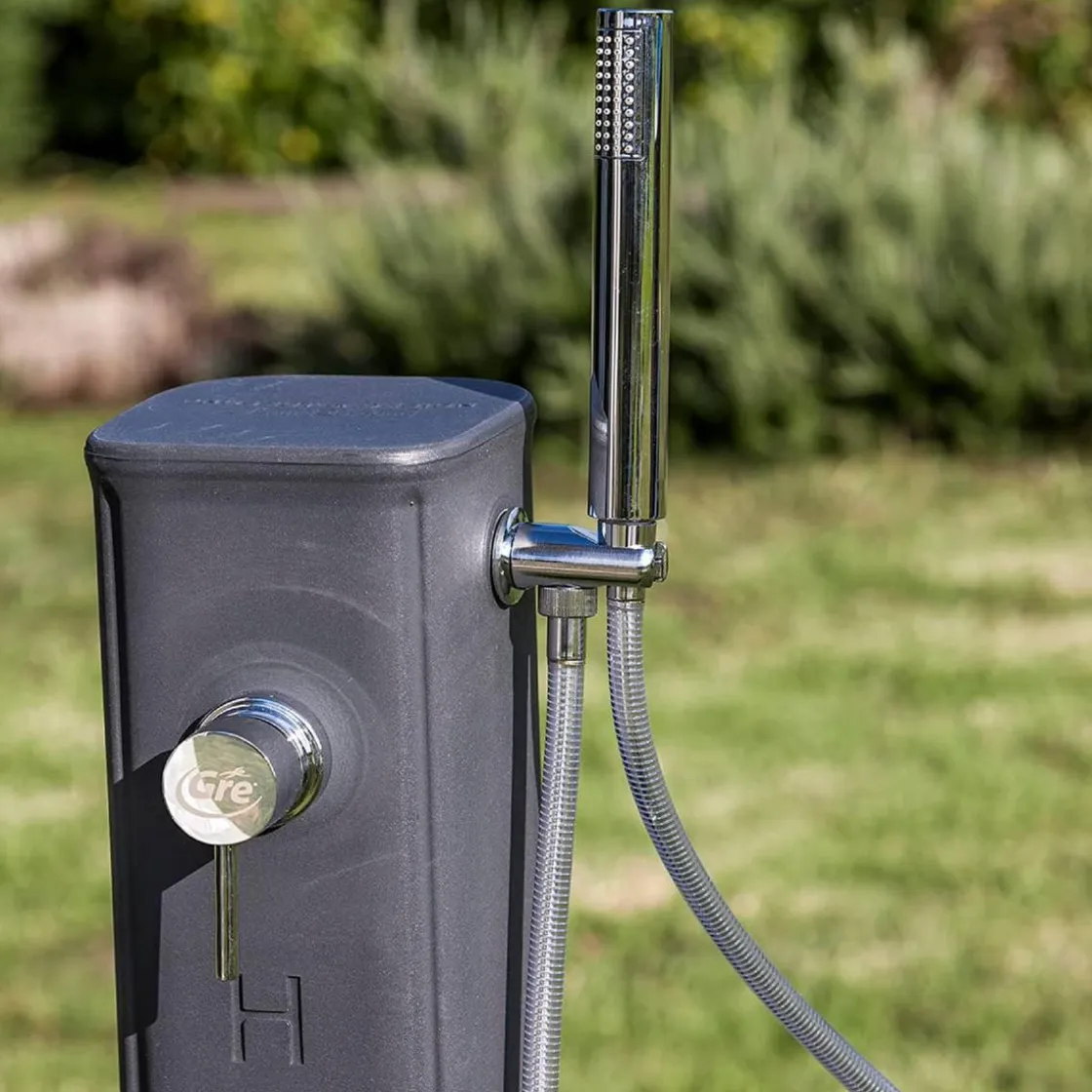 Esta ducha solar es ideal para instalar en el jardín o cerca de la piscina y disfrutar de agua caliente de forma rápida.