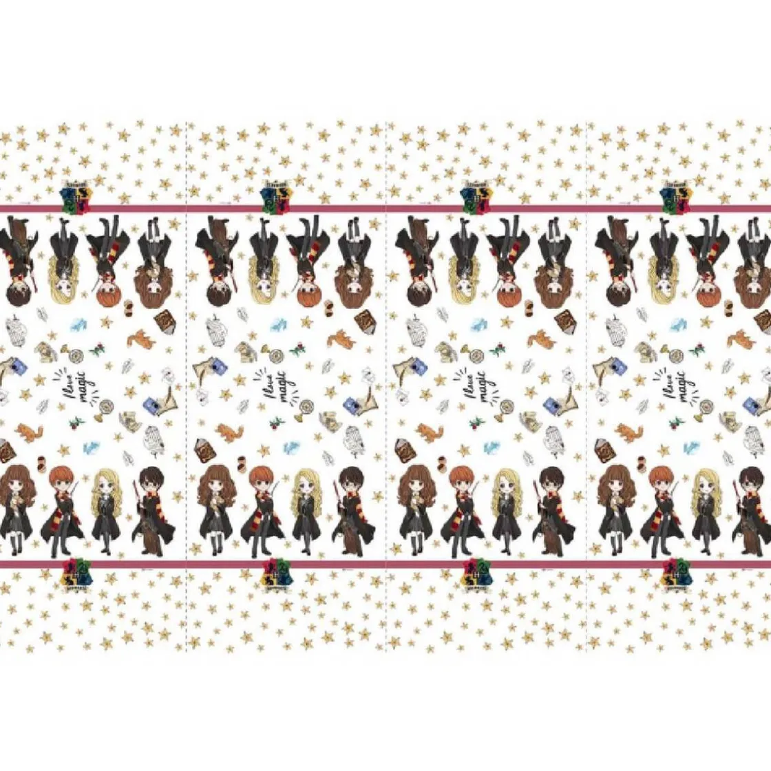 El mantel está estampado con Hermione, Ron, Harry y Luna, además de un montón de objetos de la saga que cualquier seguidor de la magia reconocerá.