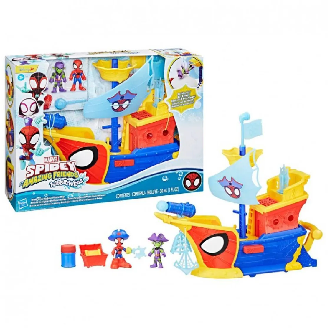 Incluye: 1 barco pirata de color azul, amarillo y rojo con timón turquesa, cañón azul eléctrico, vela turquesa con dibujo de Spidey, escaleras, palanca, un camarote, una red, una torre de control, 1 sombrero de color morado, 1 sombrero de color azul, 1 figura Spidey, 1 figura villano, 1 cofre del tesoro, 1 bote para hacer burbujas (30 ml) y muchos más detalles de lujo.