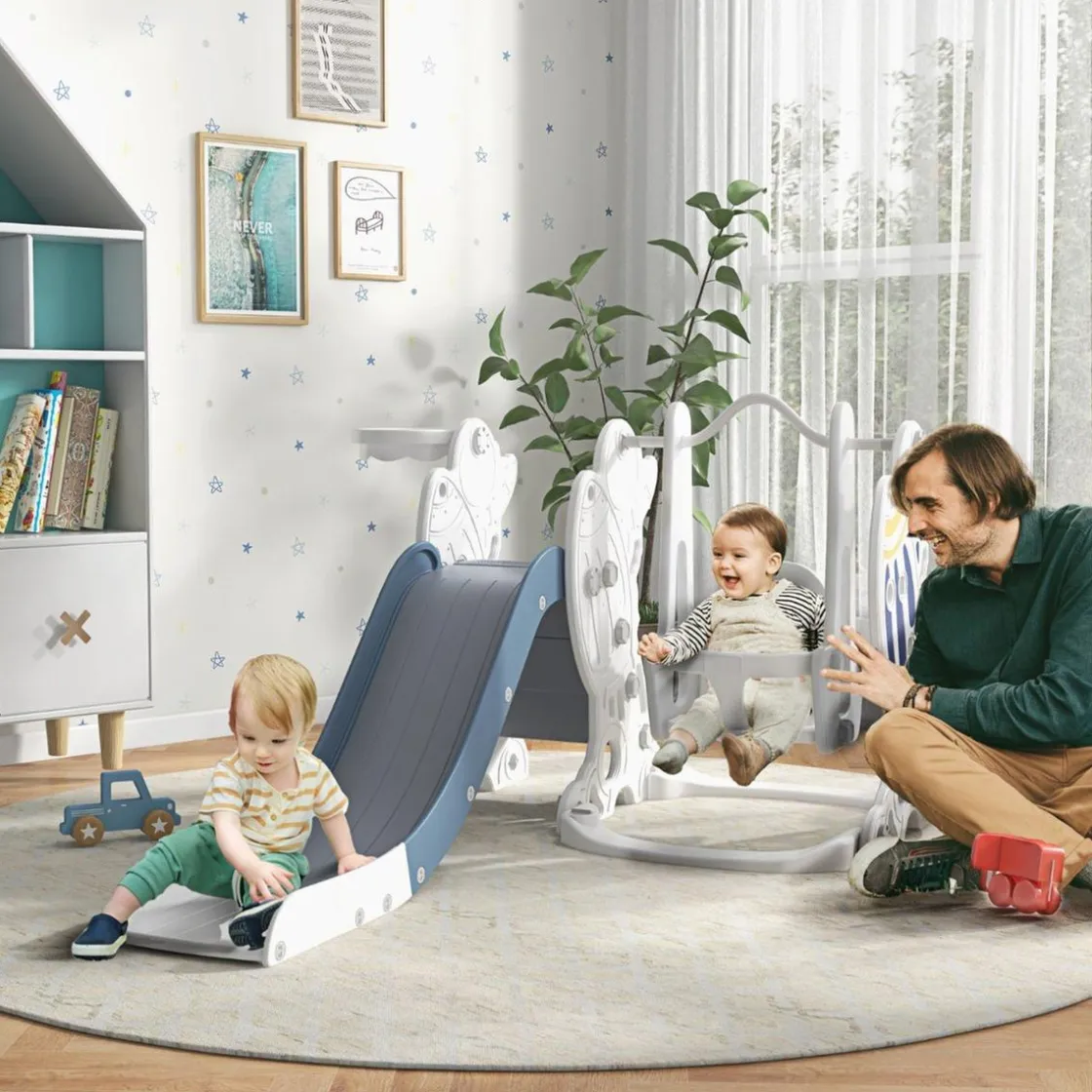 Aiyaplay – Tobogán, columpio y canasta, un juego infantil 3 en 1 que consta de un tobogán, un columpio y un aro de baloncesto (incluye pelota). Ofrece múltiples formas de diversión mientras permite que los niños se ejerciten y desarrollen habilidades como la coordinación mano-ojo y el equilibrio.