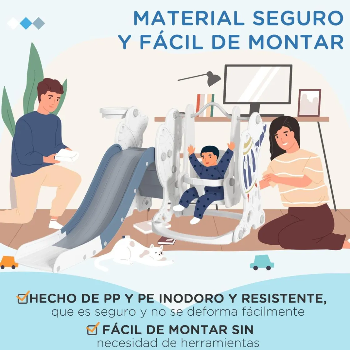 - 3 en 1, compuesto por tobogán, columpio y canasta de baloncesto