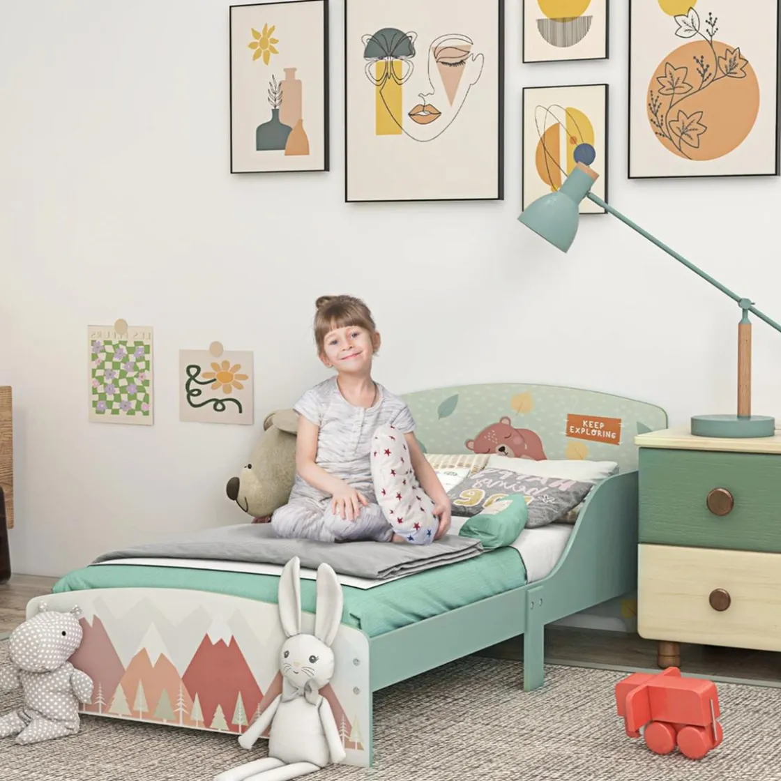 Homcom – Cama infantil Montañas Verde, una cama con un diseño bajo que permite que los niños pequeños puedan subir fácilmente.