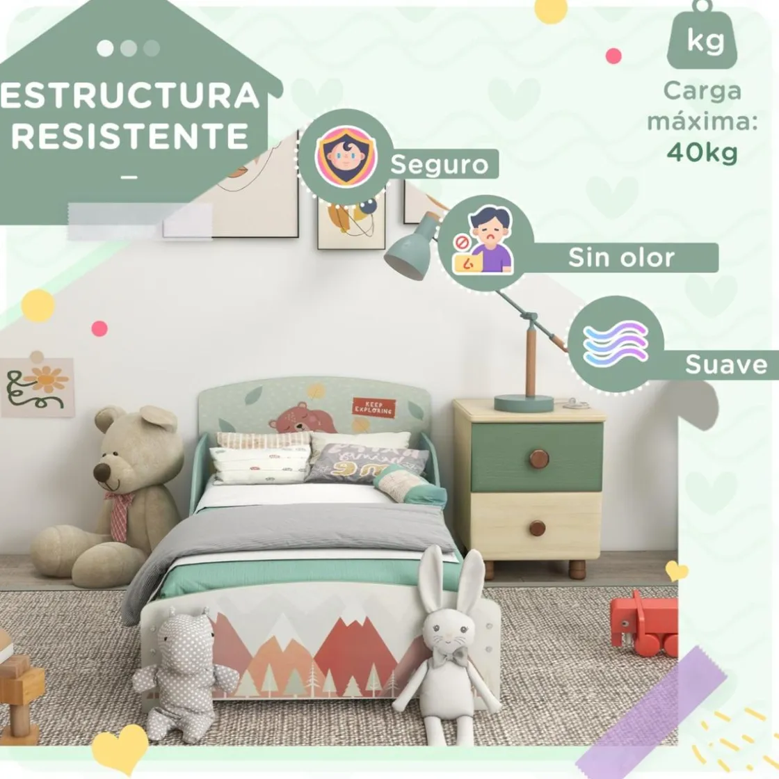 El diseño de esta cama, junto a su color de fondo en color verde y el bonito estampado en el cabezal y pie de cama, crea una atmósfera encantadora de ensueño que enamorará a pequeños y grandes.