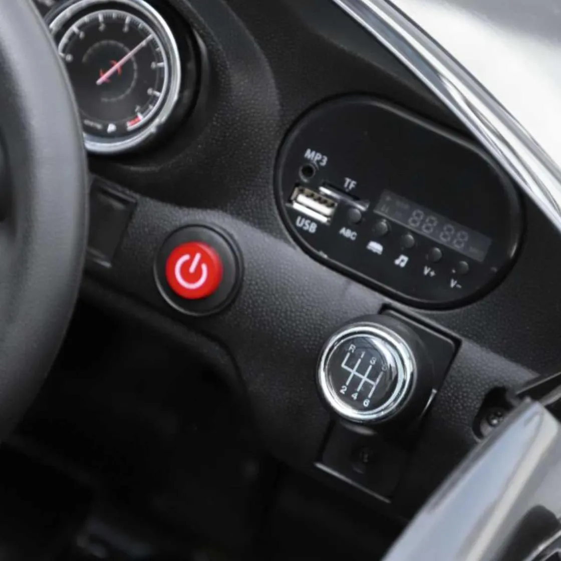 Este estupendo coche eléctrico, posee también luces en el tablero de control, y una ranura para tarjeta de memoria y USB para que puedan reproducir música en formato MP3, y sentirse todos unos conductores reales.